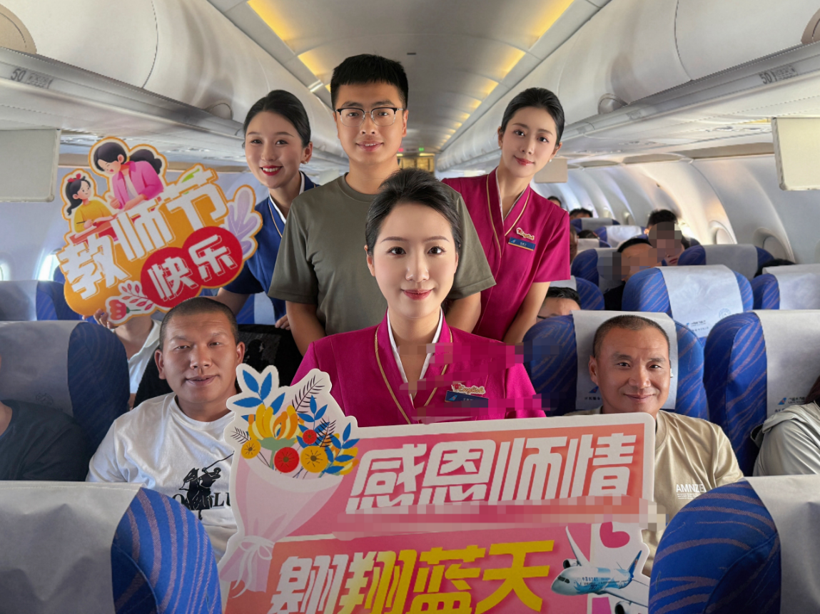 On the occasion of Teacher's Day, the China Southern Airlines Jilin Branch created a series of flight themes "Teacher's Love and Love The Blue Sky" on flights from Changchun to Guangzhou, Chongqing and Shenzhen, inviting a warm happy festive teachers and studying at 10,000 meters, and creating a warm -up -to -creator of the teachers Passenger.