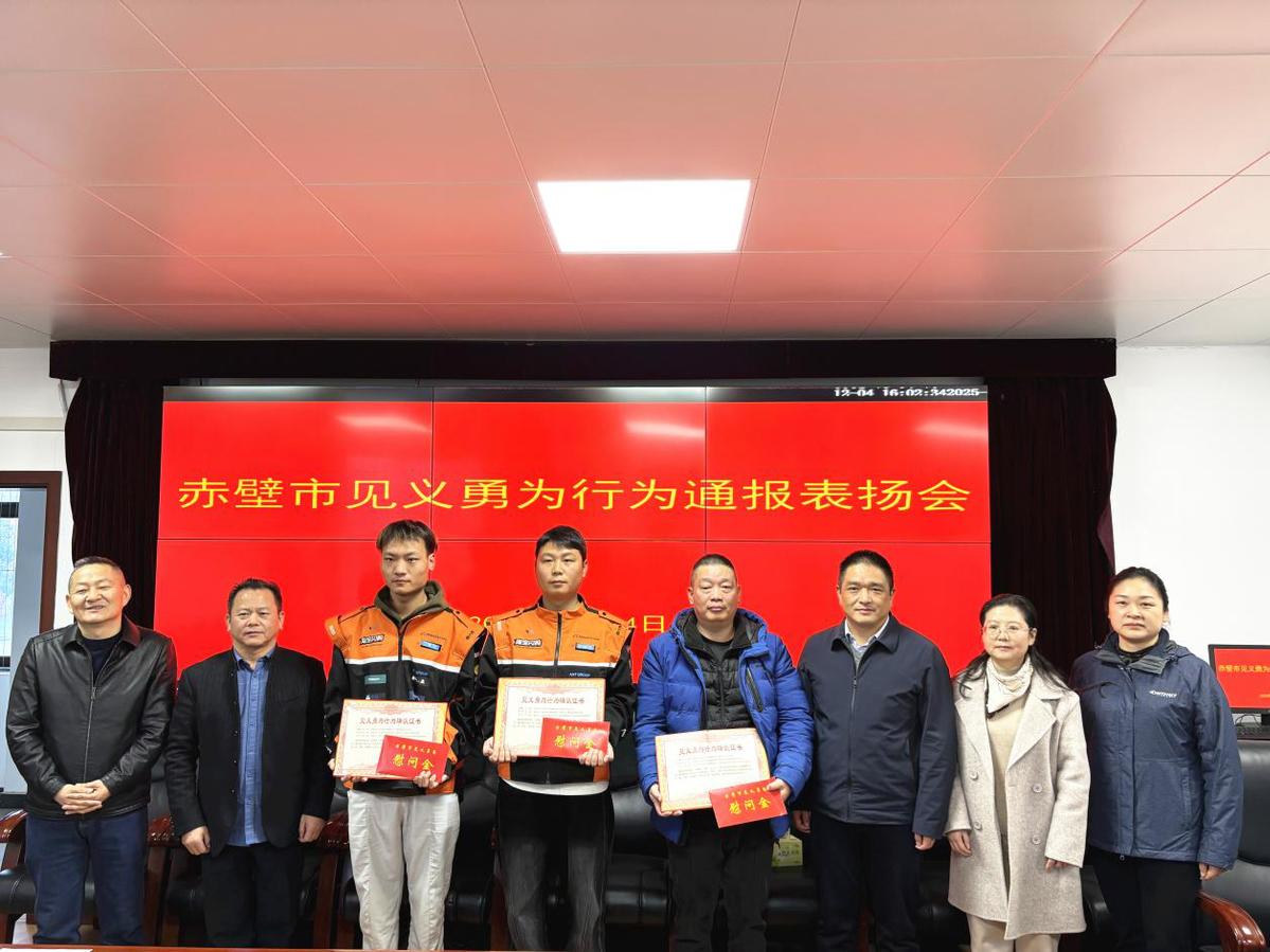 12月4日,赤壁市2025年第五次见义勇为大会召开。赤壁市委常委、市委政法委书记王辉为张继光、龚胜、王玉江颁发见义勇为行为确认证书。